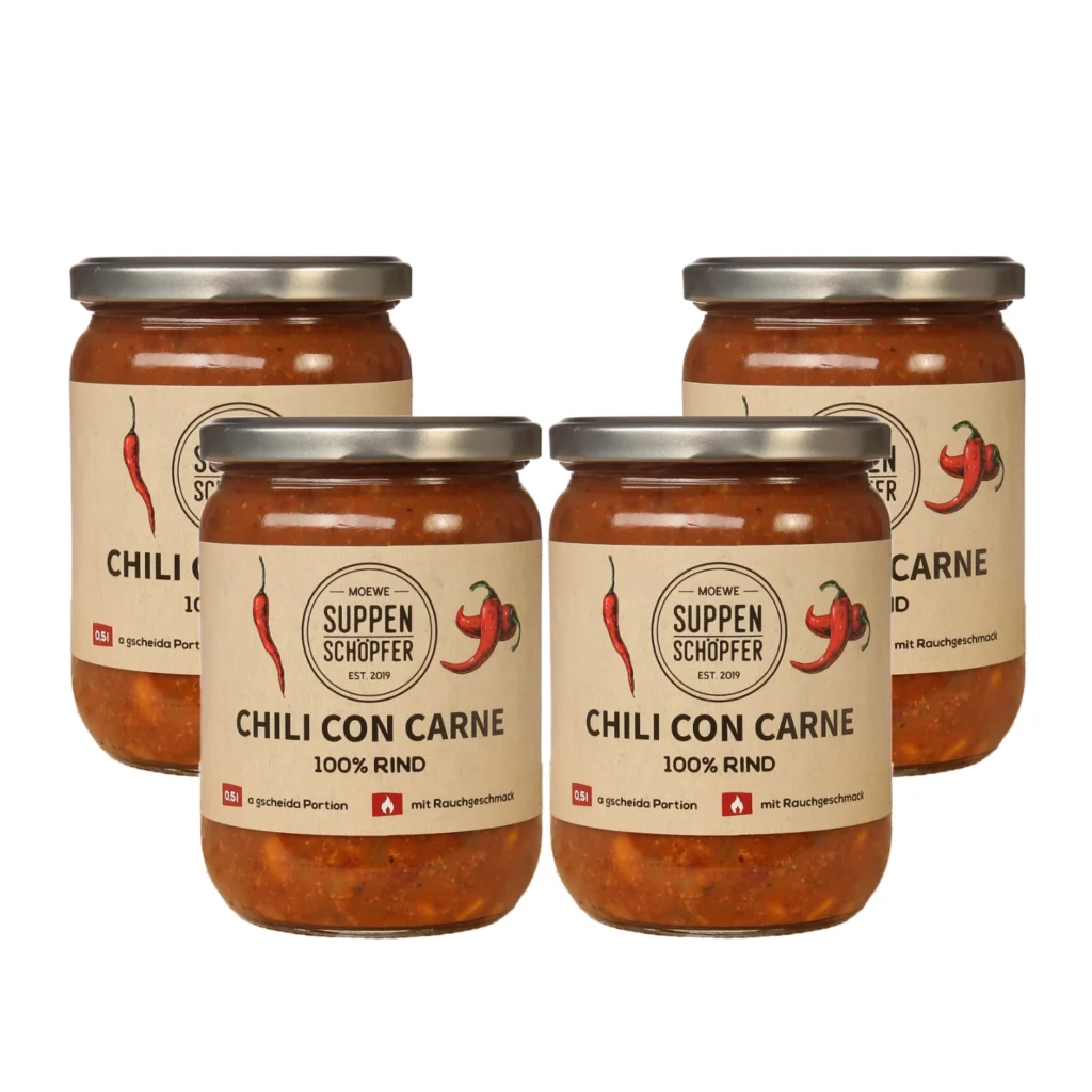 1 Chili sin Carne, 1 Kürbis-Kartoffelsuppe, 1 Rote Linse, 1 Pilzsuppe.