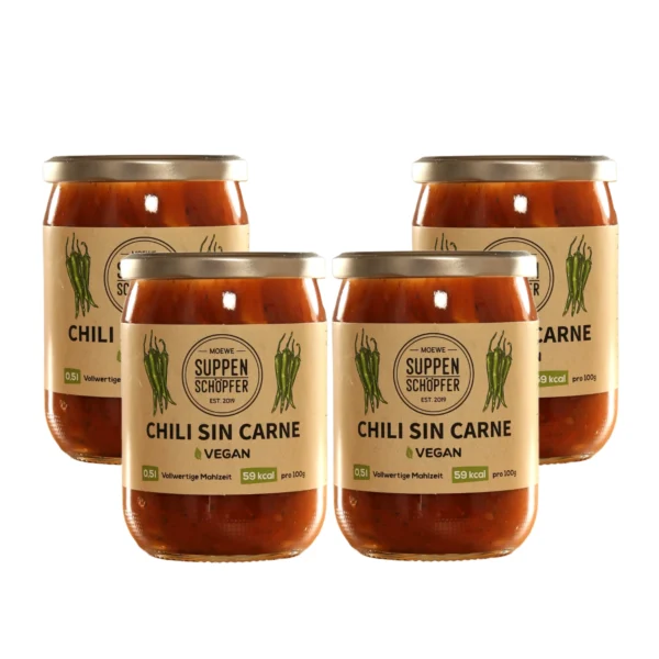 Unsere Suppen werden immer im Set von 4 Gläsern versendet. Du erhälst eine Suppenbox mit 4 x 500ml Chili sin Carne.