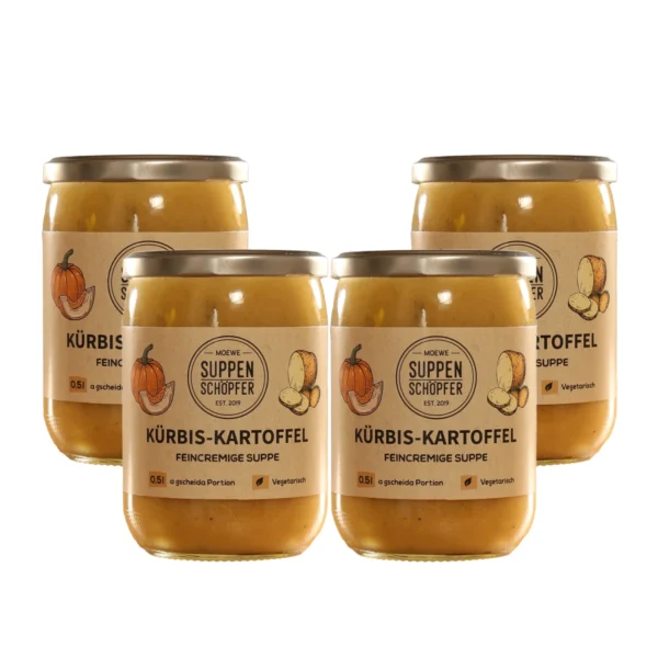 Unsere Suppen werden immer im Set von 4 Gläsern versendet. Du erhälst eine Suppenbox mit 4 x 500ml Kürbis-Kartoffel-Suppe.