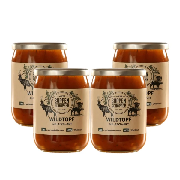 Unsere Suppen werden immer im Set von 4 Gläsern versendet. Du erhälst eine Suppenbox mit 4 x 500ml Wildtopf.